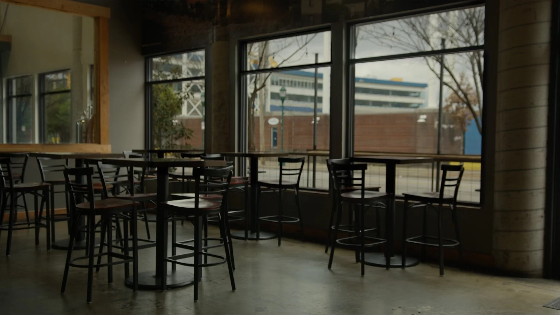 The coffee shop provides a view of the city through its windows and features a minimalist aesthetic design.