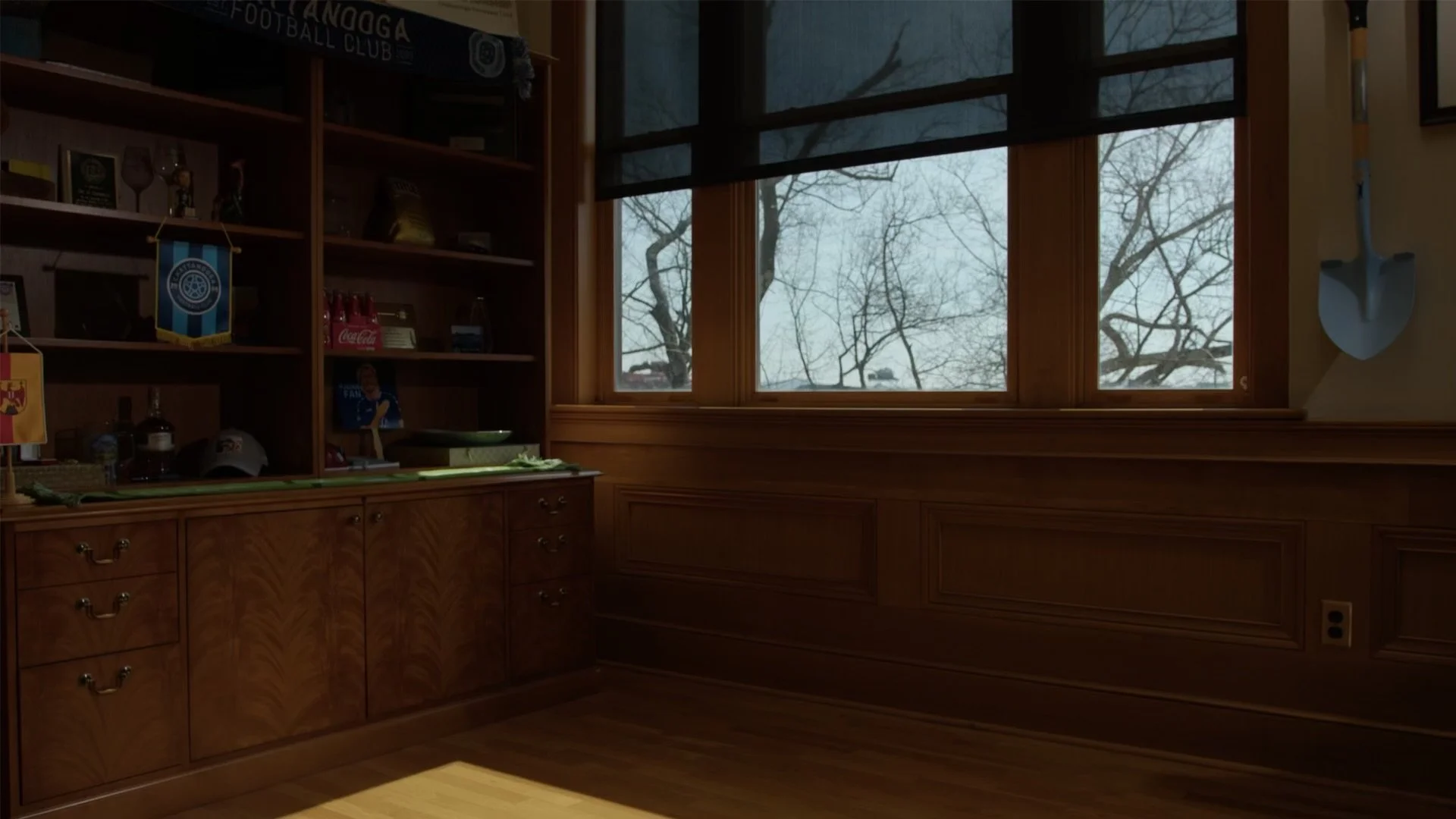 The study area features expansive windows that allow warm, golden sunset light to stream across the shelves of books lining the walls.